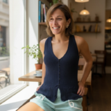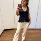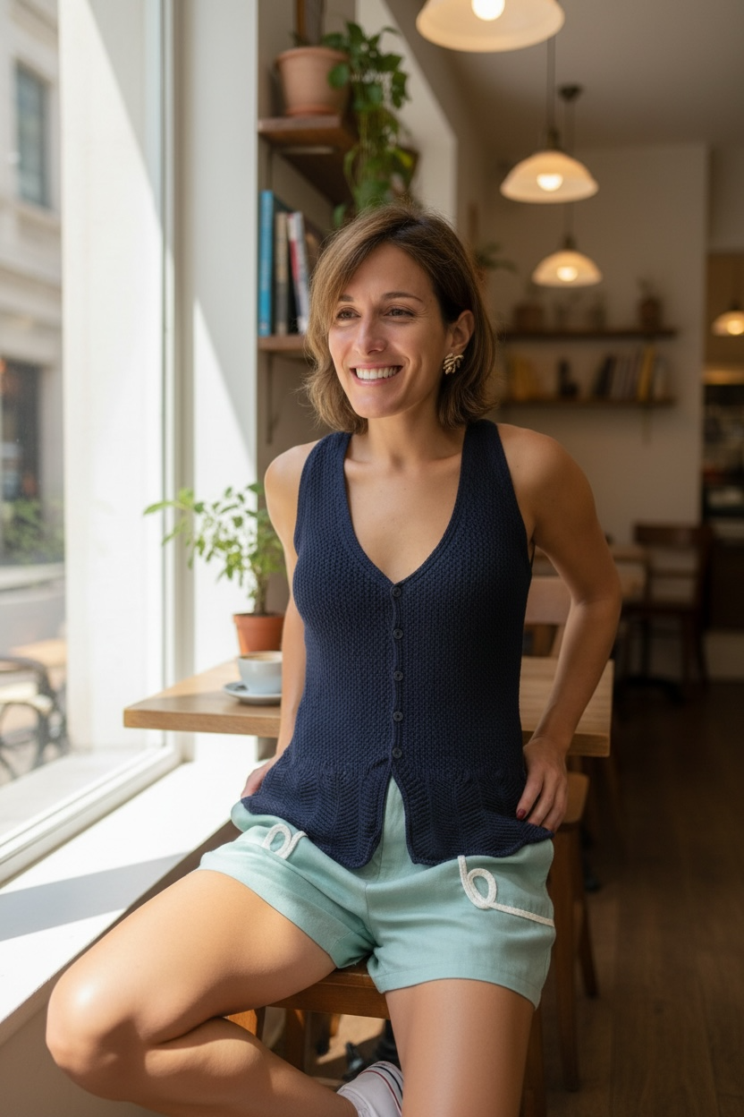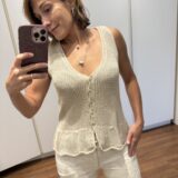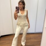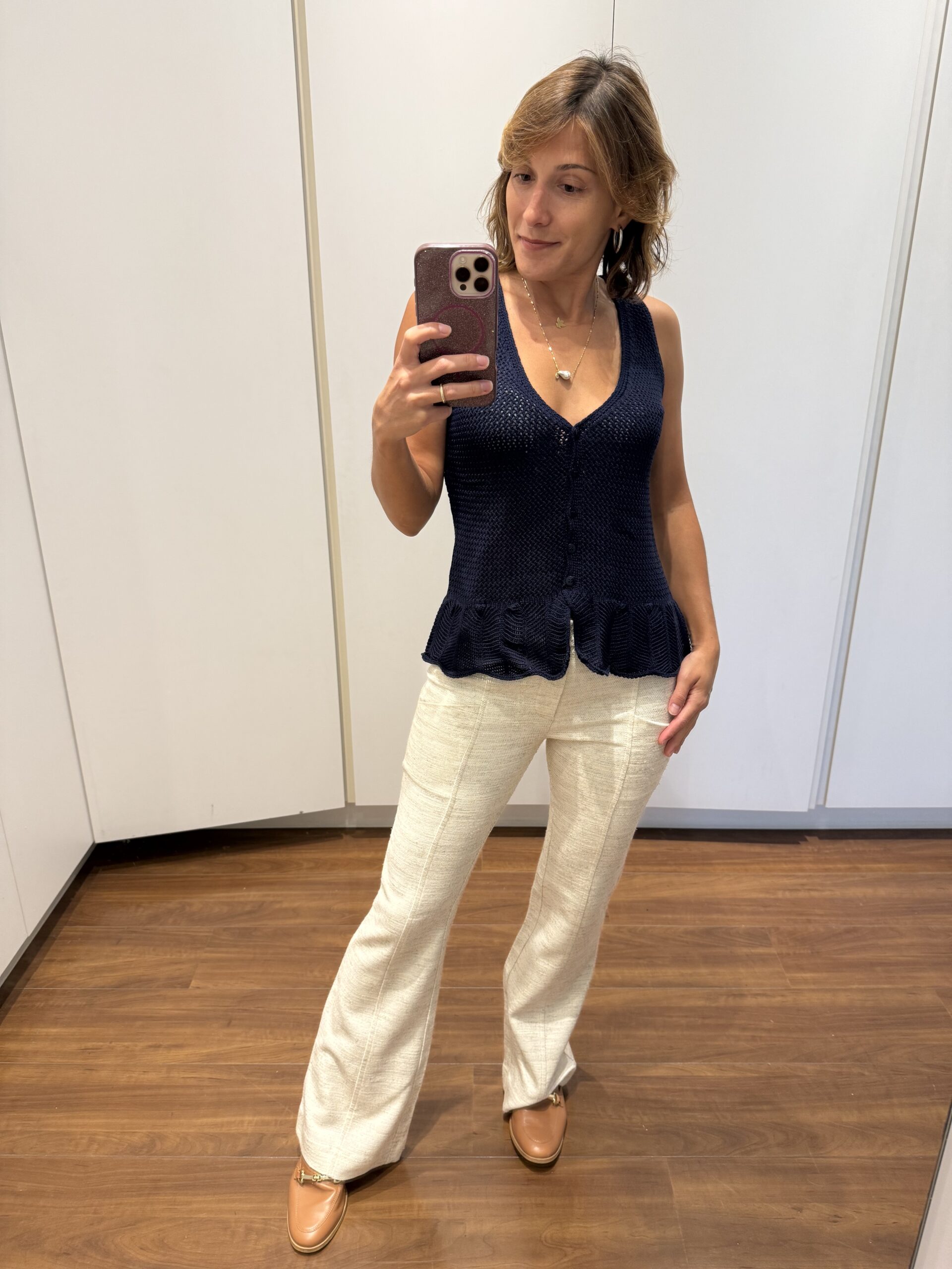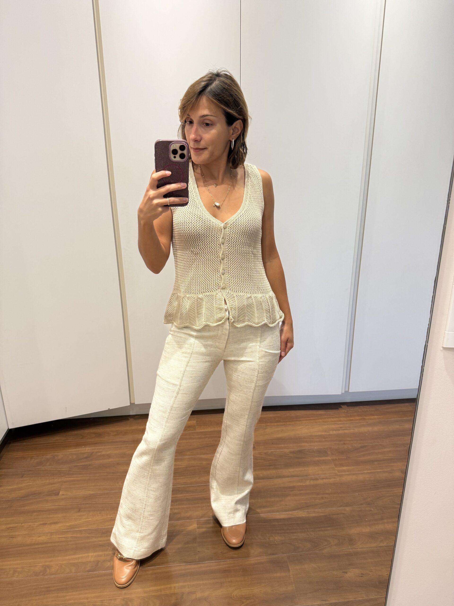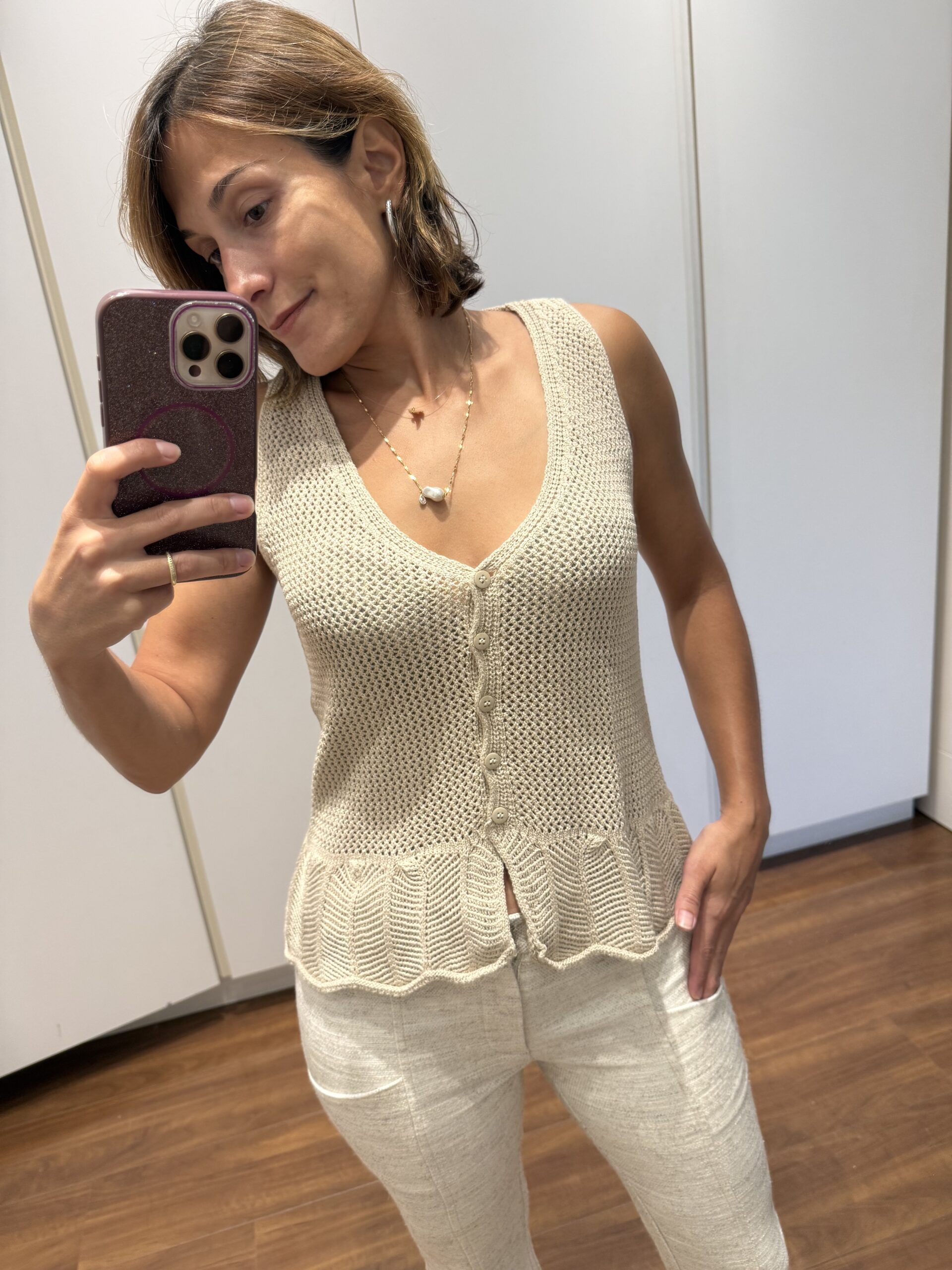 Regata em tricot estilo furadinha com detalhes na parte de baixo.