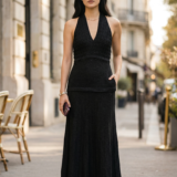 Vestido Longo frente única, com saia plissada, em Tricot.